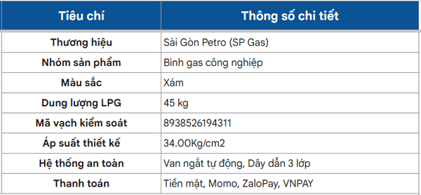 Bảng Thông Số Kỹ Thuật Bình Gas Sài Gòn Petro Xám 45Kg
